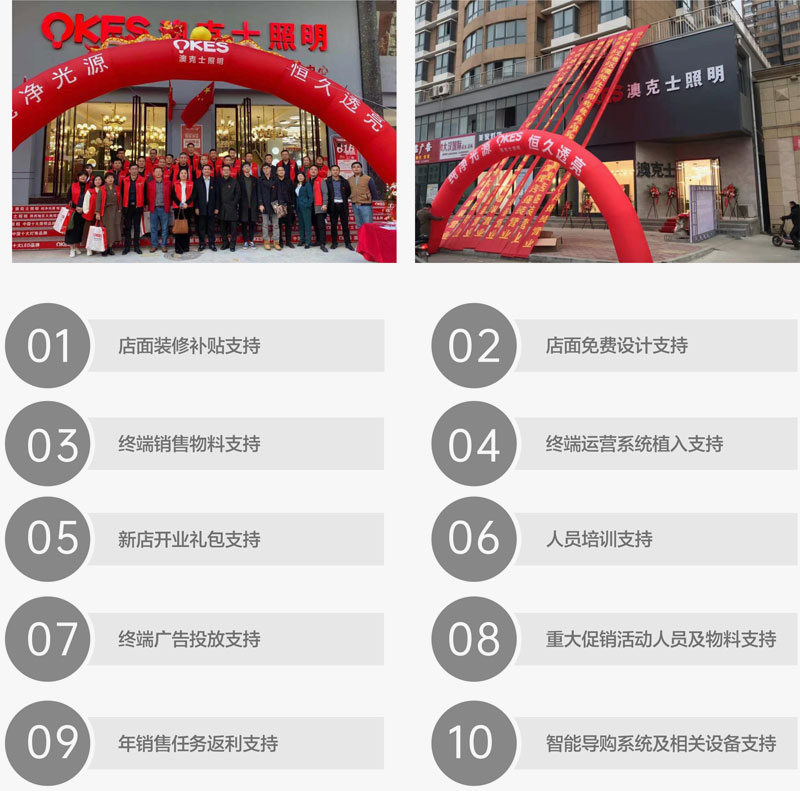 澳克士智能照明從店面選址指導、店面規劃尺量、圖紙設計、裝修跟進、上樣指導、店面布置到開業方案策劃及落地、物料配置標準化流程化支持,讓經銷商輕松開業、一炮打響。
